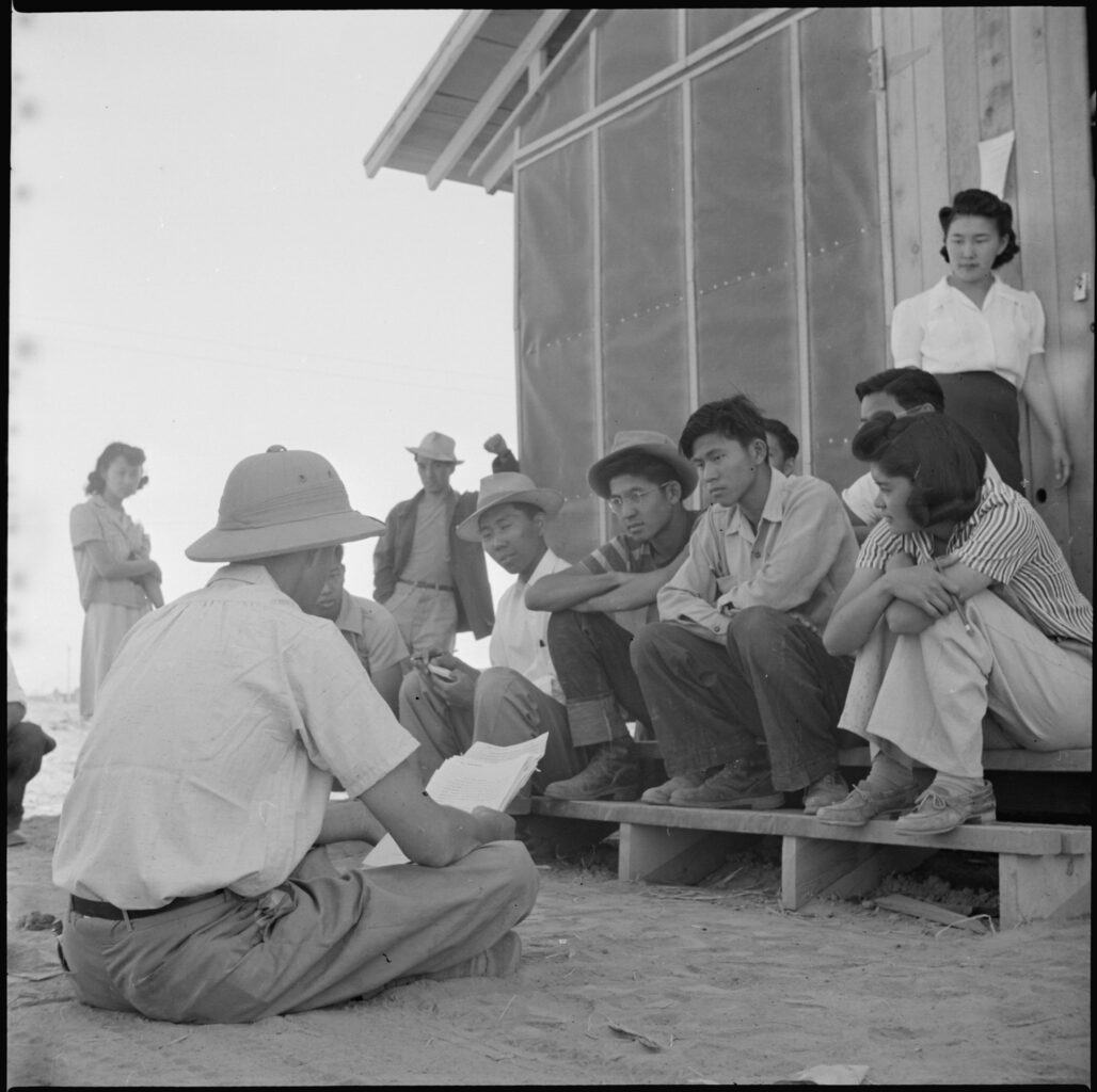 Poston, Arizona. A War Relocation Authority representative gives instructions and assignments to imprisoned people outside of a tar paper shack at the Poston camp.