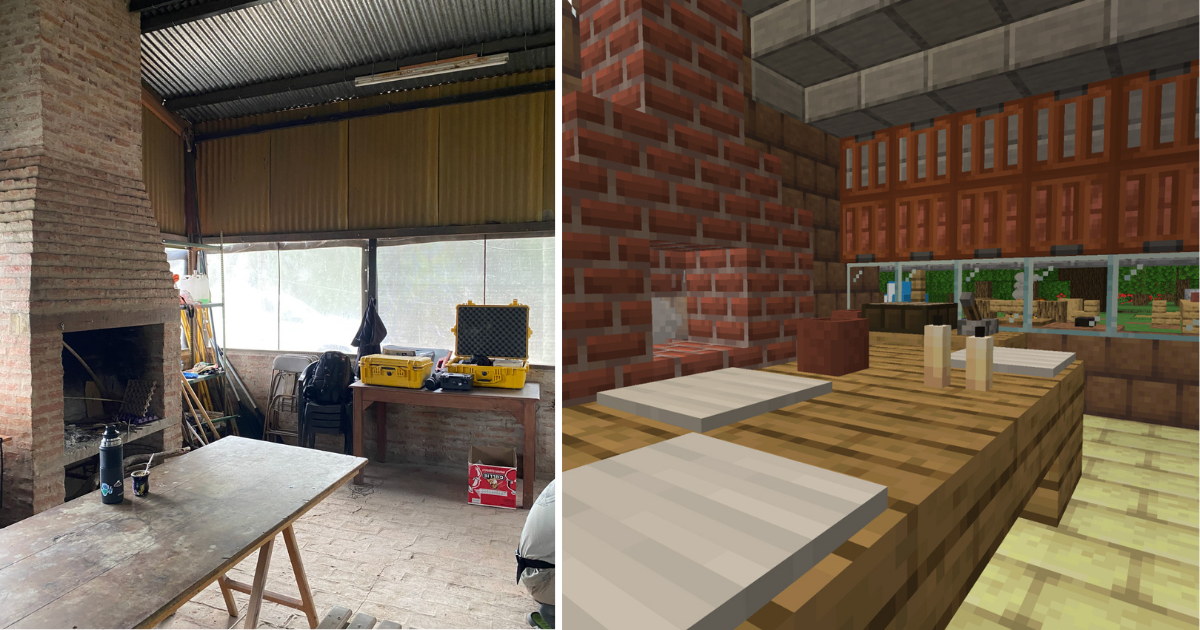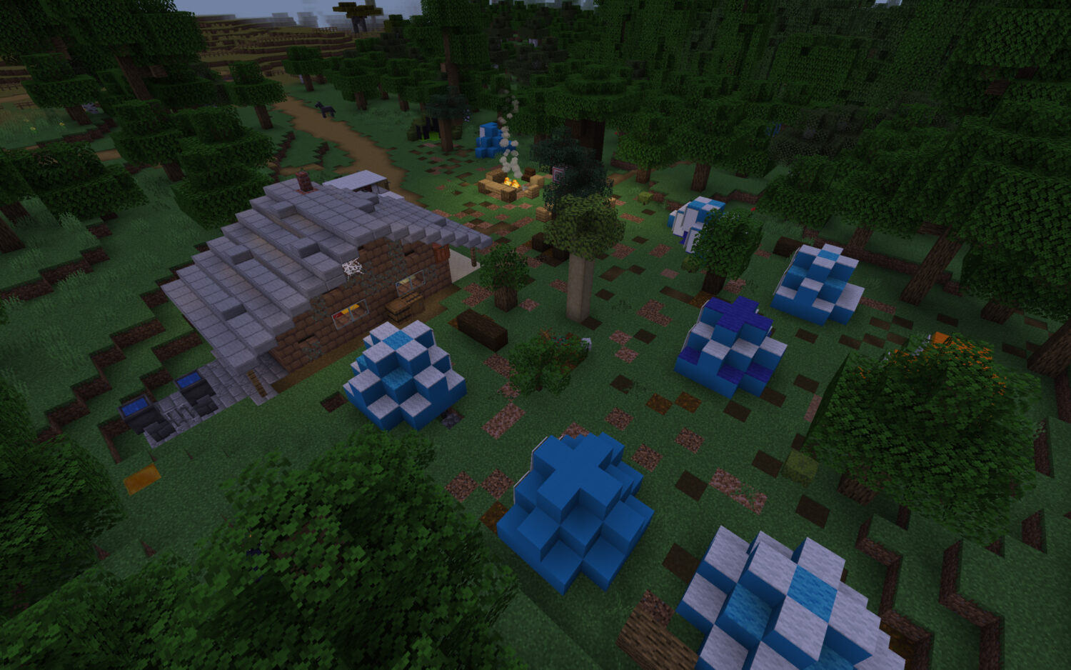 I started off by finding an area in the randomly generated world that was somewhat similar to our site. Our camp sits right along a river inside a large cattle ranch, so I spent a long time looking for a large forest bordered by a vast open area and a body of water. Once I was happy with a spot, I got to work building our camp, adding tents (which I learned are quite hard to build in Minecraft), one of our trucks, and the “Quincho”, the main building in camp where we cooked, worked, hung out, and more.