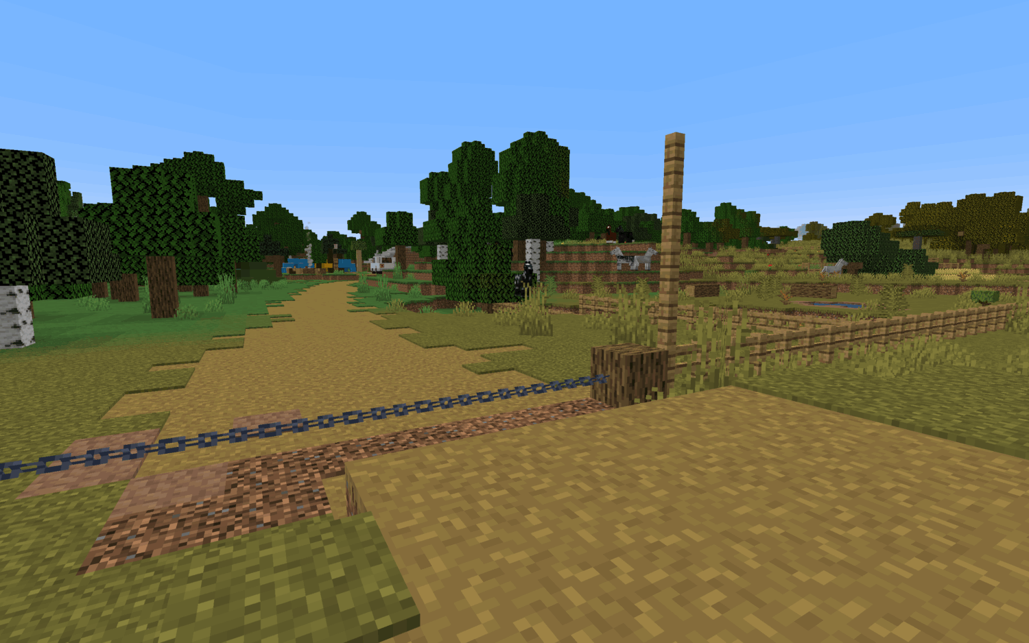 Once I was happy with that, I got to work on the ditch-filled dirt road that leads out of camp and turned the Minecraft savannah into the fields where cattle, buffalo, and horses roam around. In some areas, these fields seem to stretch on forever, so I ensured I provided ample space for the digital livestock. After all of this was finished, I built the walking path that led to the entrance of the main study forest.
