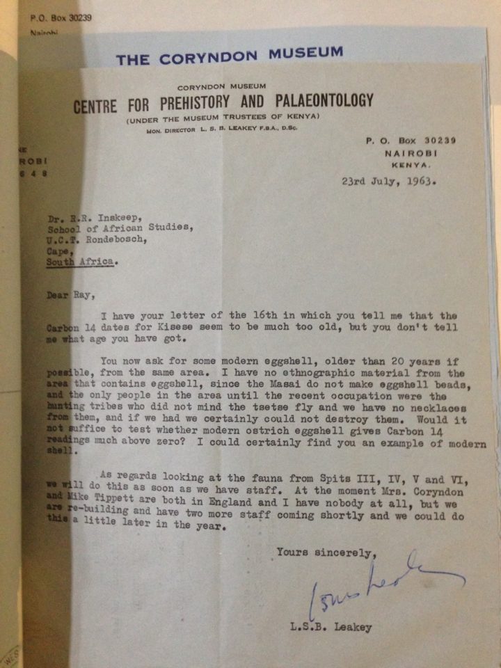 Thanks to funding from the Leakey Foundation, we’re now expanding on these results by focusing on the lithic artifacts and fossil fauna to understand changes in the environment, ecology, and foraging practices across multiple Late Pleistocene-Holocene human technological and behavioral shifts. Again, our first priority was to find more archival records, which led me to the McDonald Institute for Archaeological Research at Cambridge University in the UK in December 2016. This incredible facility enabled me to search Ray Inskeep’s personal archives for any contextual information that would help us when analyzing the Kisese II faunal and lithic material. Hidden amongst a lifetime’s worth of records and remembrances, I was lucky enough to find correspondence between Inskeep and colleagues about the Kisese II project and photos of the site during work there, including one of Louis Leakey visiting the site. I also found Inskeep’s plans and sections from the excavation, and raw data on the lithic artifact counts by category and level. This documentary evidence is of great importance for reconstructing a full context for the materials from the site. While at Cambridge, I was also invited to give a lecture about this work in the Department of Archaeology and Anthropology’s Biological Anthropology Seminar Series.