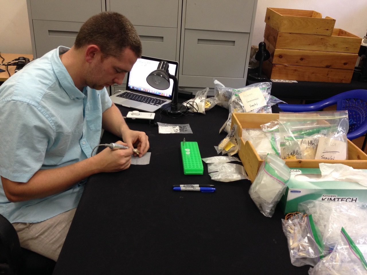 With this valuable new archival information, I then traveled to Dar es Salaam to coordinate with Tanzanian project members and to collect enamel, dentin, bone, and OES samples from the Kisese II collection. I spent two weeks identifying appropriate specimens, photographing and recording them, and drilling off small amounts of bioapatite for export. These samples have been sent to Rhonda Quinn at Seton Hall University for isotopic analysis, the results of which will tell us more information about the past ecology- like what types of plants ancient animals ate around the site. A subset of mammal teeth was serially sampled up the crown to investigate changes in the degree of seasonality through time. We also exported more ostrich eggshell fragments, which Elizabeth Niespolo at UC Berkeley is analyzing to better understand the paleoenvironment. As part of our project’s outreach program, NMT staff members were trained in sample collection and preparation, a complete set of drilling equipment and supplies were donated to the museum, and we’re working together to develop an official policy on destructive sampling. A few days after I left Dar, project member Kathryn Ranhorn, a doctoral candidate at George Washington University, arrived and analyzed the lithic artifacts to discern changes in tool production behaviors.
