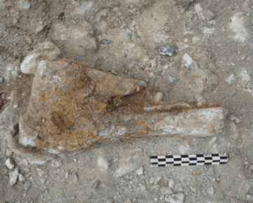 In the current state of knowledge, the following species have been identified: Elephas antiquus, Bison, Megaceros, Cervids, small bovids, birds … (Figures 4, 5, 6). Microfauna and sediment samples for malacofaunal studies were recovered through the systematic sieving of sediments. The study mission of this material, scheduled for December, will lead to more precise species identification and identify any possible anthropogenic marks. More than 200 lithic objects were recorded in level I, associated with the faunal material. They consist of discoid-type cores, flakes, tools (denticulates, sidescrapers) on small flint nodules (Figures 6, 7). In order to carry out microwear studies and residue analysis, the lithic material was not washed. Several objects on limestone pebbles were also recorded.