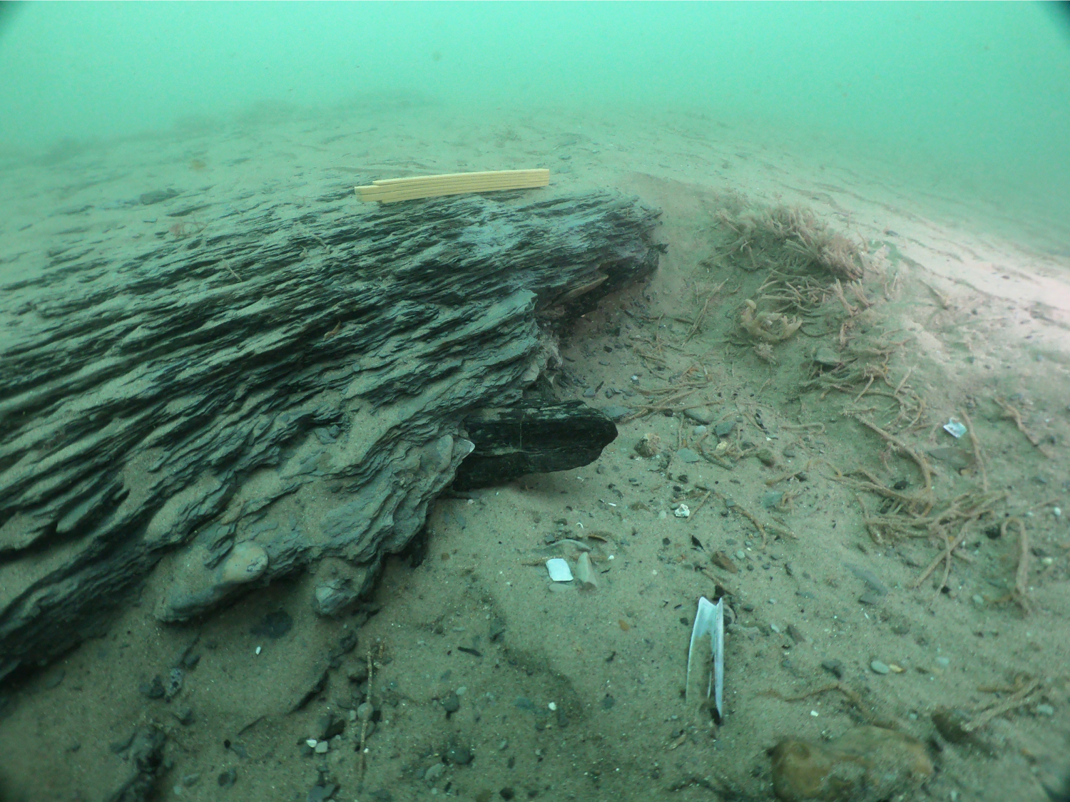 Day one was an exciting indication of what was to come, when we dropped-down on a large exposure of laminated Cromer Forest-bed deposits (Figure 3). Having never been able to locate these offshore before, this was a breakthrough. The amazing weather—very unusual for a British summer—allowed us the full two weeks of work, and we spent this time both searching for finds, as well as trying to maximize the information we could come away with from the deposits themselves.