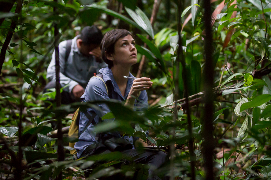 Habituation didn’t always go smoothly, as the groups were very different in their reaction to people. With some of the groups, it took only weeks for the monkeys to fully accept us and to completely ignore our presence. But some groups were just as skittish after many months of habituation attempts as they had been in the beginning; with one especially “bad” group, we had to eventually give up after 8 months of trying. This difference still puzzles me, as it cannot be explained by either groups’ proximity to the camp or the habitat structure, nor by the possible prior exposure to hunting. However, other researchers at EBQB had very similar experience 20 years ago. One of the groups they were trying to habituate was still running from them after several months — and interestingly, it was located in the same area as our “bad” group. At the same time, they could easily habituate one group whose home range corresponds to one of our “good” groups. Since the monkey generations have surely changed since then, this pattern might have something to do with genetic traits (individual variation) — and also might tell us something about the dispersal patterns in titis.
