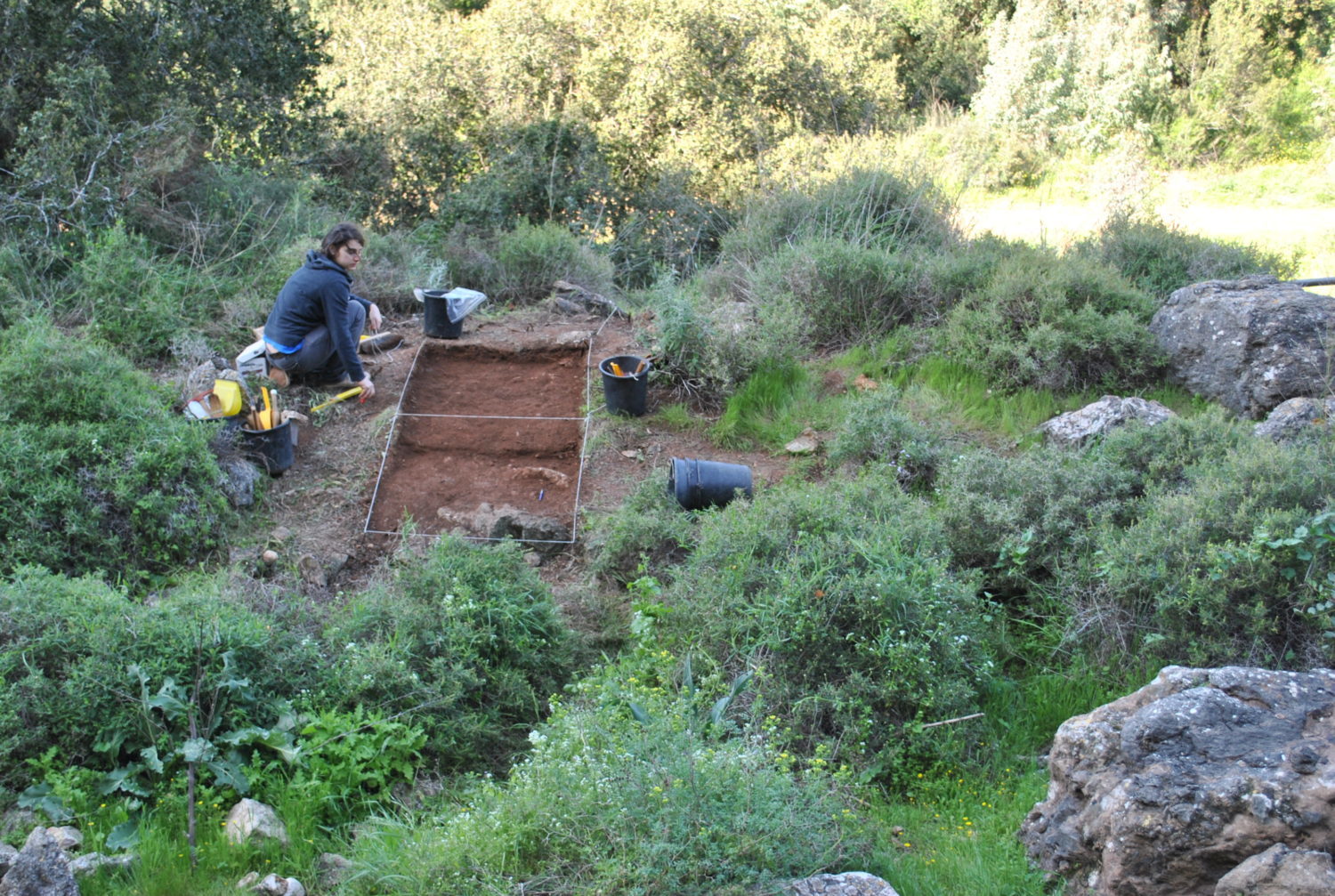 Unfortunately, the data from 1930’s excavations at Skhul is highly fragmented due to the lack of a systematic collection of finds and the coarse-grained excavation techniques typical of the early 20th century. A series of papers discussing various aspects of the skeletons as well as certain behavioral aspects provide just glimpses of the site’s potential. While it has long been believed that Skhul was excavated down to bedrock between 1931 and 1932, careful reading of McCown’s text and figures suggests that the northern edge of the deposits is still intact and buried under the 1930’s excavation dump. Accordingly, a test excavation in February 2016 uncovered below the dump the old excavation’s northern section and the adjacent in situ archaeological sediments. The intact Middle Paleolithic layer exposed is rich in lithics, fauna and microfauna.